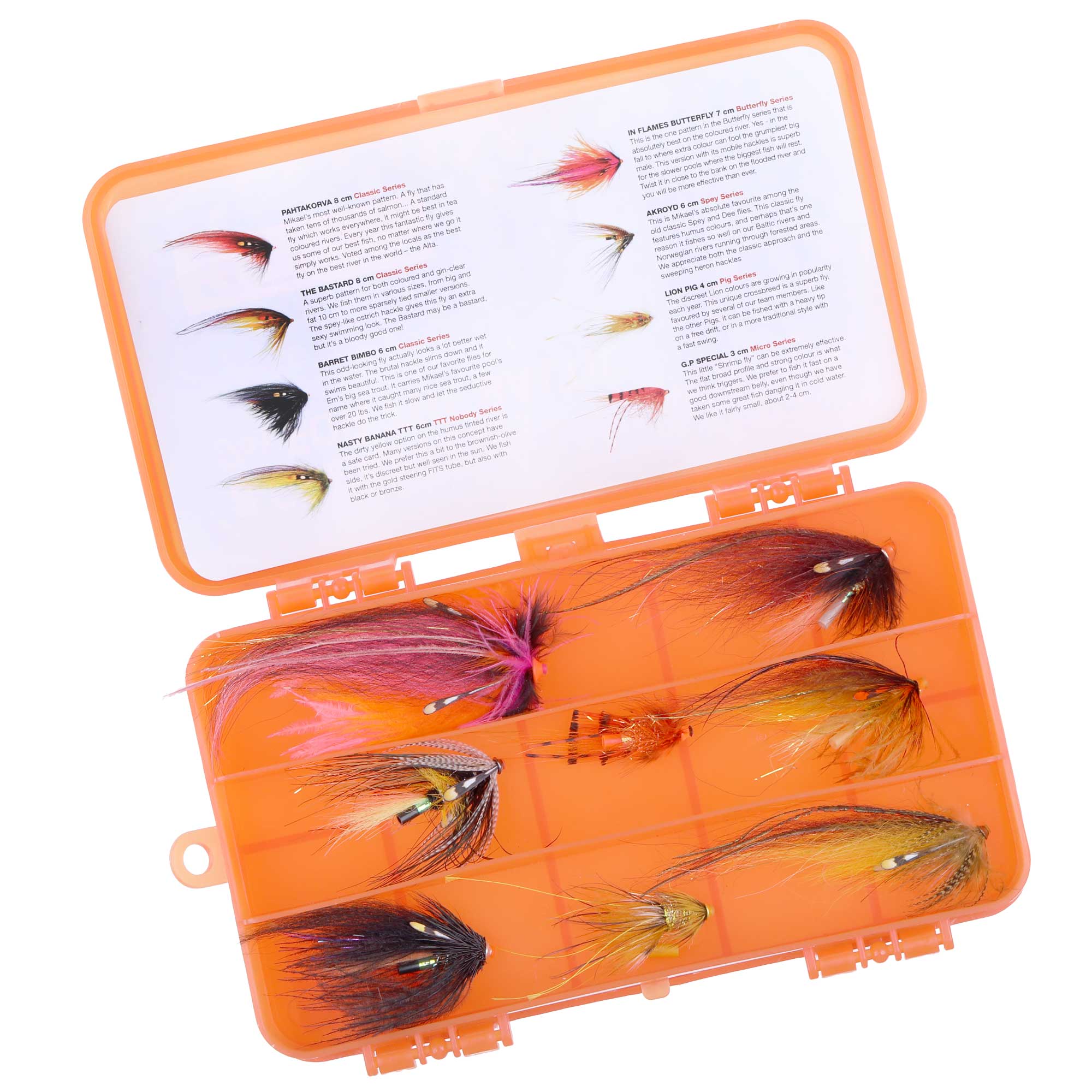 Dieses Frödin Set beinhalten 8 von Mikaels Lieblings Fliegen für baltische Lachse und werden inklusive einer Frödin Salar Supreme Fliegendose geliefert. Im Deckel der Boxen befindet sich außerdem eine reiß- und wasserfeste Beschreibung und Kurzanleitung der beiliegenden Muster, die Aufschluss über konkrete Führungsweisen sowie Hinweise bezüglich der Einsatzzwecke der jeweiligen Muster gibt – das erleichtern die Auswahl des passenden Musters erheblich! Selbstverständlich handelt es sich bei den Fliegen der Frödin Fly Selection um absolut tadellos gebundene Muster, für deren Herstellung hochqualitative Bindematerialien aus Mikael Frödins eigenem Sortiment verwendet werden wie z. B. 'Salar Synthetic Series' (SSS) und 'Frödins Improved Tube System' (FITS).