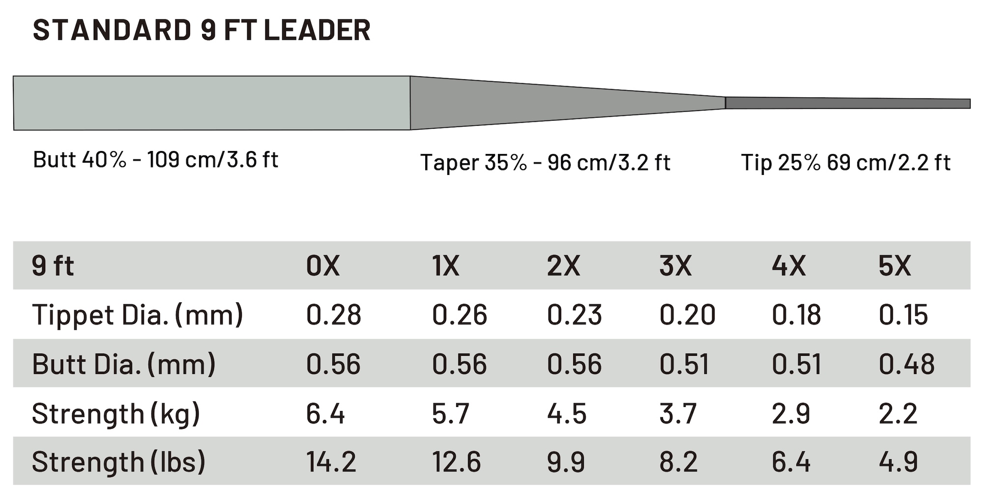 | 9 ft | 0X 0,28 mm | 0,56 mm | 6,4 kg |