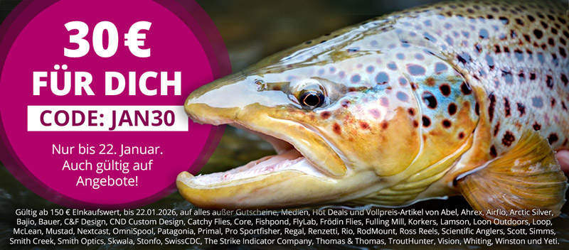 *30€ ab 150€ gültig auch auf Angebote. Nicht gültig auf: Gutscheine, Medien, sowie Vollpreisartikel von Abel, Ahrex, Airflo, Arctic Silver, Bajio, Bauer, C&F Design, CND Custom Design, Catchy Flies, Core, Fishpond, FlyLab, Frödin Flies, Fulling Mill, Korkers, Lamson, Loon Outdoors, Loop, McLean, Mustad, Nextcast, OmniSpool, Patagonia, Primal, Pro Sportfisher, Regal, Renzetti, Rio, RodMount, Ross Reels, Scientific Anglers, Scott, Simms, Smith Creek, Smith Optics, Skwala, Stonfo, SwissCDC, The Strike Indicator Company, Thomas & Thomas, TroutHunter, Vision, Whiting, Winston und Yeti. Nicht kombinierbar mit Hot Deals oder anderen Aktions-Codes.