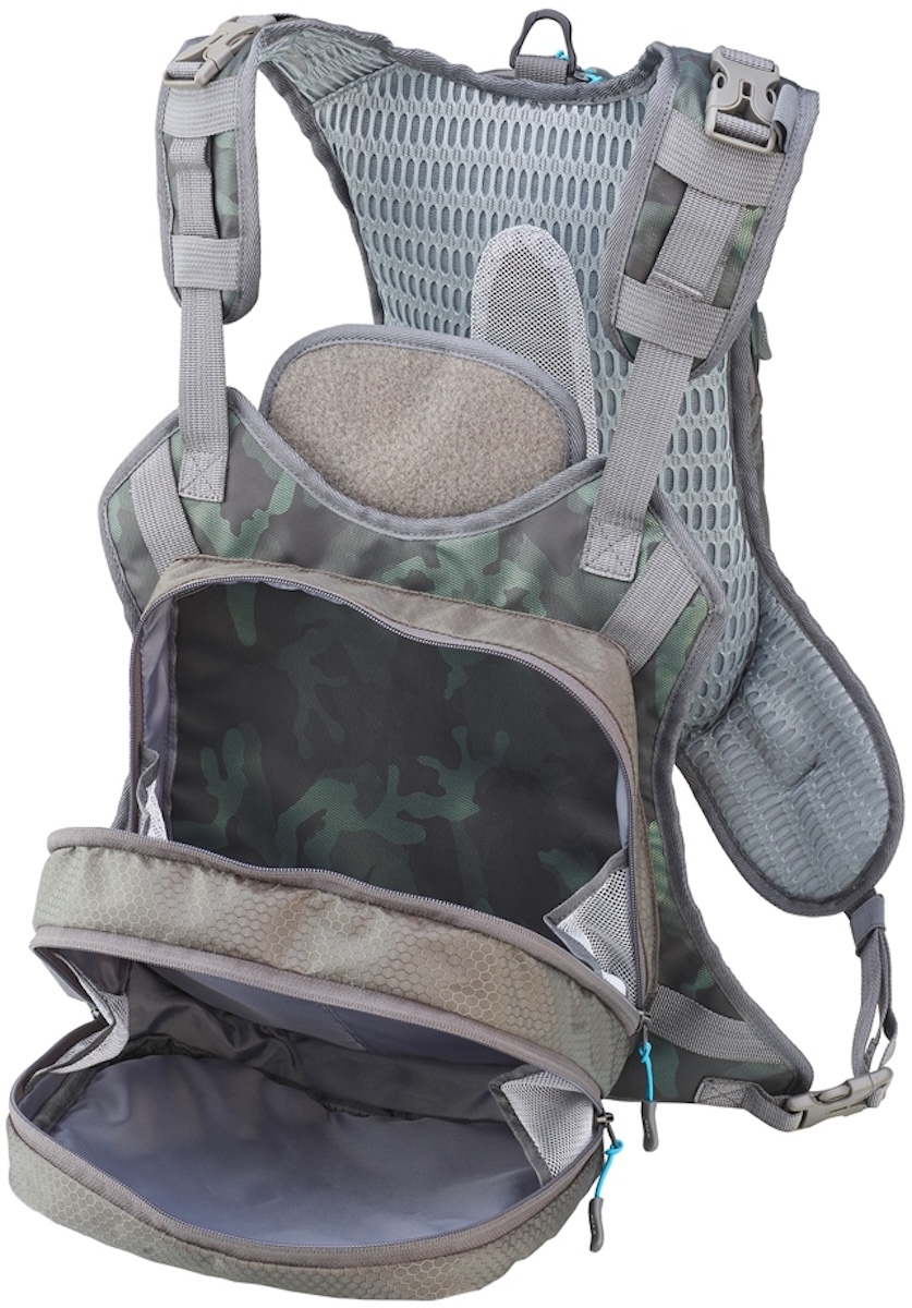 Vorne befinden sich mehrere große YKK® Reißverschlussfächer mit großzügigem Fassungsvermögen und unterteilten Bereichen, die dir helfen, Fliegendosen, Kleinteile und Zubehör zu ordnen. Zusätzlich gibt es eine große Reißverschlusstasche an der Rückseite mit weiterem Innenfach und einer flachen Tasche, ideal um weiteres Material oder persönliche Gegenstände sicher zu verstauen. Eine breite Velcro Patch Zone an der Vorderseite eignet sich zur Befestigung von Pinzetten, Indikatoren oder Pin Clips. Ein D‑Ring an der Rückseite erlaubt es dir, einen Kescher sicher zu befestigen.