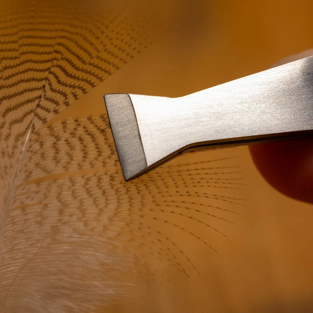 Die Renomed Edelstahl Pinzette FT4 ist eine Fasergreifpinzette, die speziell dafür entwickelt wurde, Fasern sauber vom Federkiel zu trennen oder Materialien kontrolliert aufzunehmen. Sie verfügt über eine breite, flache Spitze mit einer Greiffläche von etwa 10 mm – ideal, um Fasern von Hahnenfedern oder weicheren Federn wie Huhn, Ente oder Rebhuhn sauber und schonend zu lösen, ohne den Kiel zu beschädigen. Mit einer Gesamtlänge von ca. 100 mm bietet sie optimale Kontrolle beim Arbeiten.