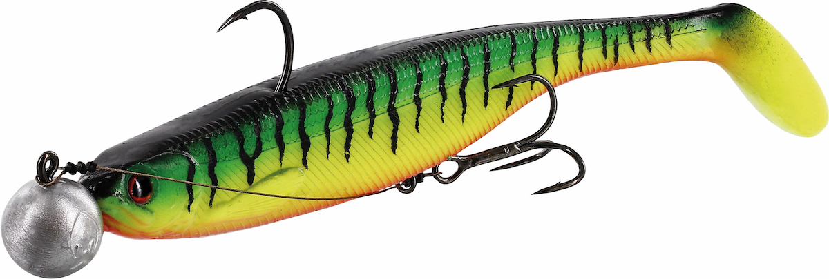 Der Shadteez Slim R N`R in der größeren Uferversion misst 14 cm und wiegt 17 g und hat einen Jigkopf mit 15 g montiert. Die ideale Größe, um gezielt die kleinen Zander zu selektieren und auf den größeren Zander zu fischen.